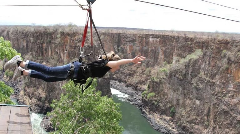 Adventurers can glide over the breathtaking Zambezi River canyon at one of the world's most thrilling zipline adventures, located at Victoria Falls. This exhilarating 425-meter ride offers an adrenaline rush unlike any other, along with stunning views of the magnificent waterfall. The breathtaking scenery below you is revealed as you soar through the air at up to 100 kilometers per hour, offering a singular viewpoint of one of nature's wonders. Because of the skillful management of the zipline adventure, participants may fully immerse themselves in the thrilling experience while still feeling safe. The zipline at Victoria Falls offers an exhilarating experience that will leave you with lasting memories, regardless of your level of experience.